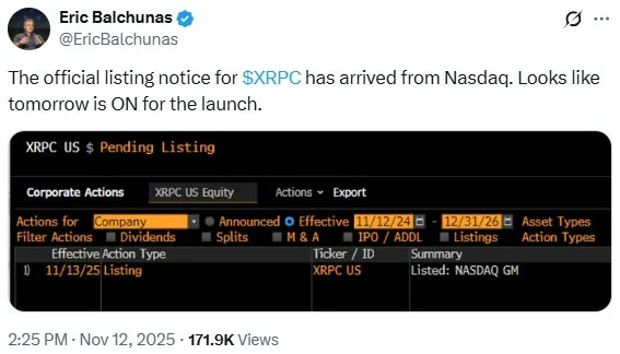 「$XRPCの公式上場通知がナスダックから届きました。どうやら明日の立ち上げは確定です」とブルームバーグETFアナリストのエリック・バルチュナスが11月12日にソーシャルメディアプラットフォームXで述べました。この上場は、11月10日に米国証券取引委員会(SEC)にForm 8-Aを提出したことに続くものであり、取引開始前の最終的な規制ステップです。