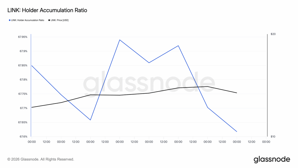 ETFの節目にもかかわらず、オンチェーンのシグナルは蓄積が鈍化していることを示唆している。Glassnodeのデータによると、Chainlinkの保有者蓄積比率は過去1週間で低下しており、本稿執筆時点では67.62%となっている。