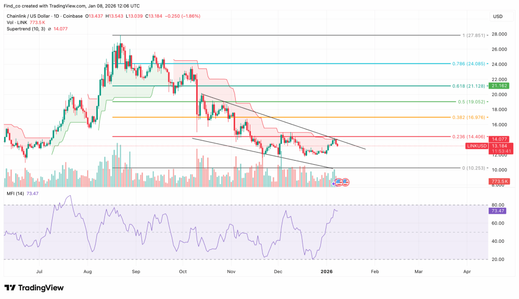 需要が増加し、LINKが構造を反転させれば、トークンは14.40ドルを突破する可能性があります。このレジスタンスがサポートに転じれば、次の目標は20ドルに向けて上昇するでしょう。