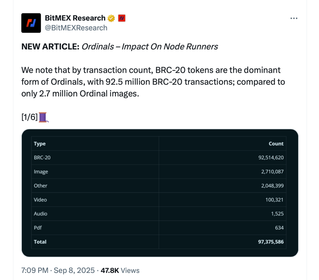 彼らはメカニズムに注目しています。本質的に、画像のペイロードは未実行のTaprootの証人フィールドにあるため、ノードは署名チェックという重いステップを回避します。それに対し、BitMEXの研究者はBRC-20のトランスファーが通常のトランザクションに類似していると述べており、これが検証を増加させ、UTXOセットを膨張させる原因となっています。このレポートでは、UTXOセットが2022年12月から2025年9月の間に8,400万から1億6,900万の出力に増大したことが、主にBRC-20の使用に関連していると推定しています。