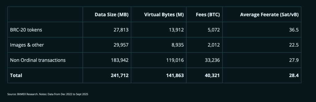 BitMEX Researchは、2022年後半からこれまでに約9,740万件のOrdinalインスクリプションがあり、その中で約9,250万件がBRC-20イベントで、270万件が画像であると集計しています。数の差があるものの、研究者たちは画像データが約30.0GBのオンチェーンスペースを使用しているのに対し、BRC-20は27.8GBであると指摘しており、画像は証人割引のために使用する重量単位が少ないとしています。