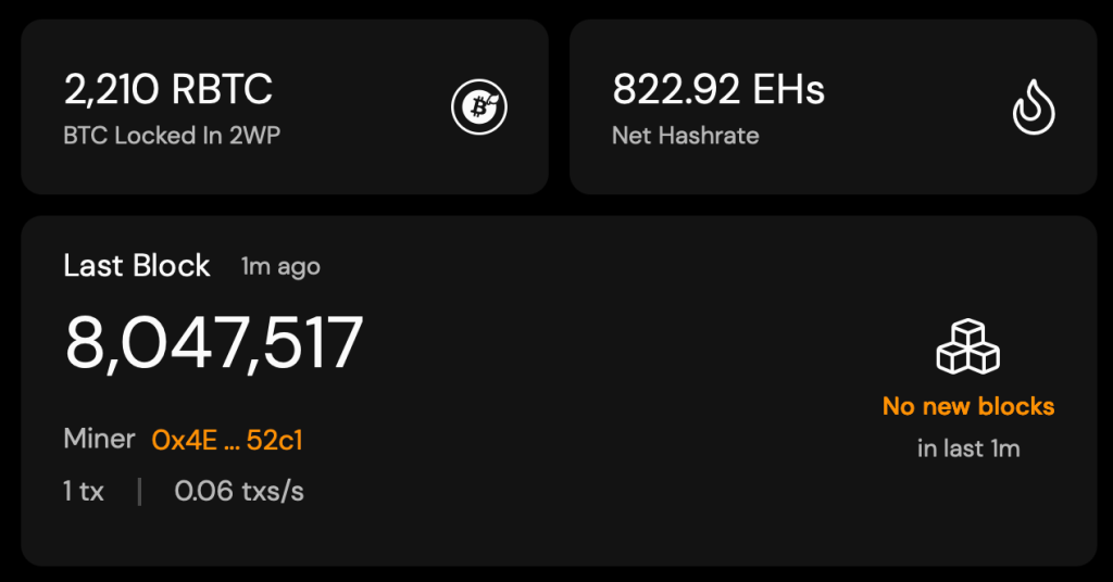 ビットコインと1:1の割合でペッグされたRBTCトークンを持つスマートコントラクト向けのビットコインサイドチェーンであるRootstockも、ビットコインの高いハッシュレートから大きな恩恵を受けています。マージマイニングを利用して、ビットコインのセキュリティを活用しながら、マイナーはBTC報酬に加えてRSKトランザクション手数料も得ています。現在、Rootstockは約822.92 EH/sを記録しています。