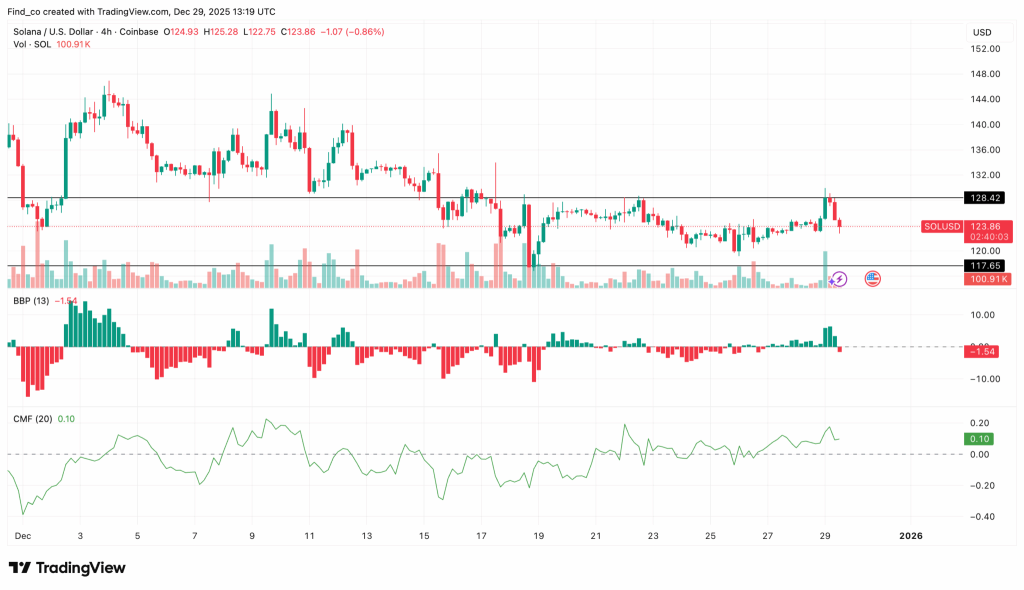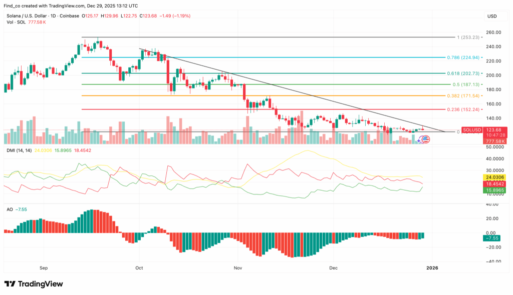 日足チャートを見ると、SOL の価格は125.63 ドルに固定されているものの、129.96 ドルの抵抗レベルを突破するのに苦労していることがわかります。