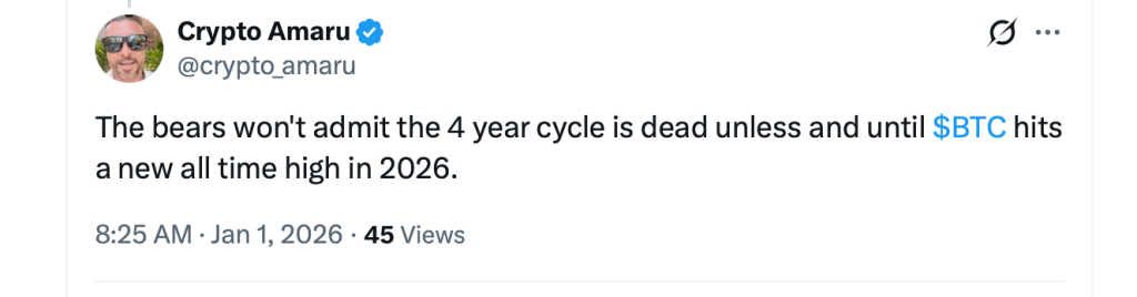 「14年ぶりに、ビットコインが半減期後の年間キャンドルとして赤で閉じました」と暗号インフルエンサーのラーク・デイビスがXで書いた。「4年サイクルが死んだという事実にようやく同意できるのか?」