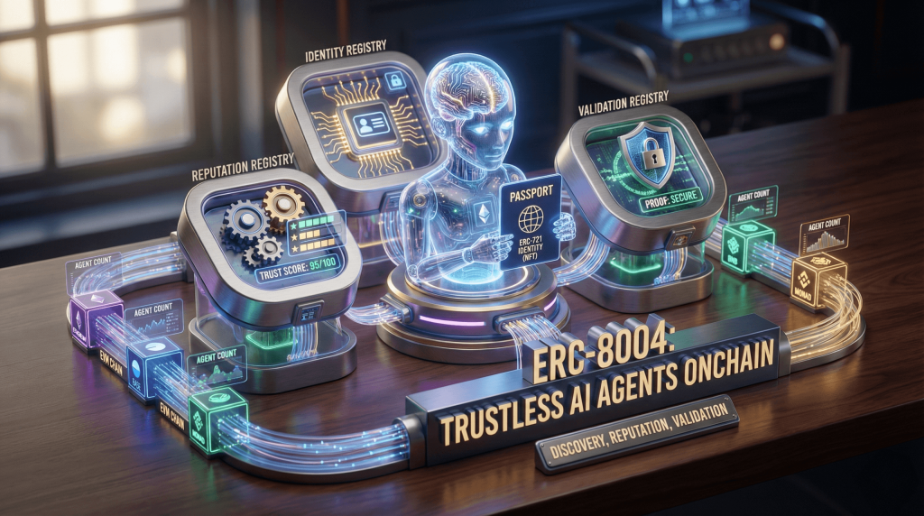 その中核として、ERC-8004は3つのオンチェーン登録簿(Identity、Reputation、Validation)を導入します。