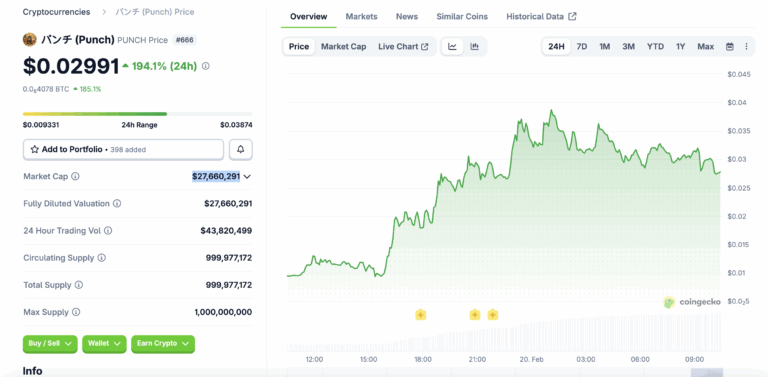 金曜日のCoinGeckoのデータによると、「Punch」というブランドのトークンは24時間で最大194%上昇した。