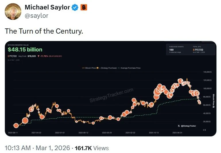セイラーは「世紀の変わり目」と記した。投稿には同社の有名な取得チャート形式が用いられており、完了したビットコイン購入をオレンジ色のマーカーで価格推移に重ねて表示している。過去には同様の投稿後に正式な購入報告が続き、通常翌営業日の朝に発表されるため、このオレンジドットチャートは暗号資産トレーダーの間で注視されるシグナルとなっている。